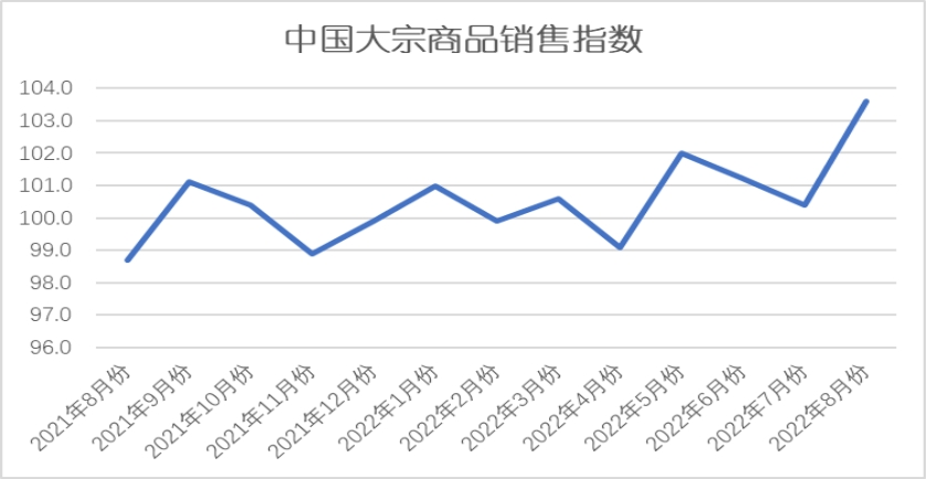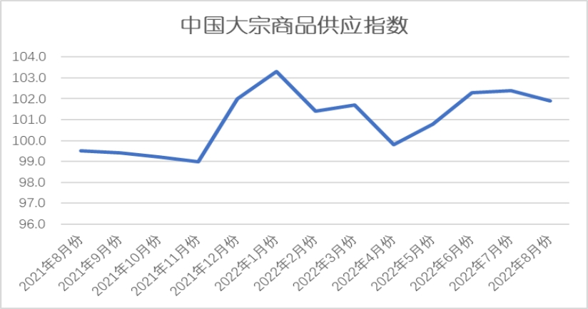 2022年8月份,大宗商品供應(yīng)指數(shù)為101.9%,較上月回落0.5個(gè)百分點(diǎn),指數(shù)在連續(xù)三個(gè)月上升后,本月出現(xiàn)回落,顯示部分商品行業(yè)受到利潤收窄、疫情管控、電力緊張等因素的影響,商品產(chǎn)量開始下降,市場供應(yīng)增速出現(xiàn)下滑。從各主要商品情況來看,本月有色金屬行業(yè)受電力供應(yīng)緊張的影響,成為調(diào)查中唯一一個(gè)出現(xiàn)供應(yīng)量下降的行業(yè),鋼鐵行業(yè)在利潤恢復(fù)的提振下,時(shí)隔兩個(gè)月后再度出現(xiàn)供應(yīng)量上升的態(tài)勢,鐵礦石、煤炭、成品油和汽車供應(yīng)量雖繼續(xù)增加,但增速有所減緩,化工供應(yīng)量繼續(xù)增加,且增速有所加快。
