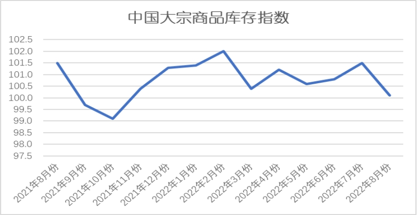 2022月8月份,大宗商品庫存指數(shù)為100.1%,較上月回落1.4個(gè)百分點(diǎn),指數(shù)跌至2021年11月份以來的最低點(diǎn),顯示隨著供給端增速減緩,消費(fèi)端開始回暖,市場供需銜接逐漸順暢,供求關(guān)系有所改善,商品庫存壓力有所緩解。各主要商品中,鋼鐵庫存量繼續(xù)下降,但降幅有所收窄,煤炭和成品油庫存量分別時(shí)隔五個(gè)月和九個(gè)月后再度下降,鐵礦石、有色金屬和汽車庫存量雖繼續(xù)增加,但增速有所減緩,化工庫存量繼續(xù)增加,增速連續(xù)兩個(gè)月加快。
