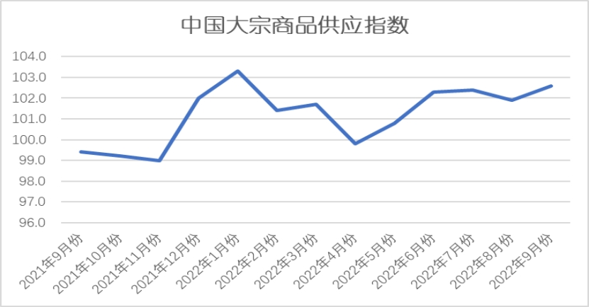 2022年9月份,大宗商品供應指數止跌反彈至102.6%,較上月回升0.5個百分點,顯示隨著國內經濟和制造業的復蘇,市場需求持續回暖,生產企業對后市預期良好,生產熱情高漲,國內大宗商品市場供應量不斷增加,增速有所加快。從各主要商品來看,本月有色金屬供應量止跌回升,鋼鐵、煤炭、成品油和化工供應量繼續上升,且增速加快,鐵礦石和汽車供應量雖較上月繼續增加,但增速有所減緩。