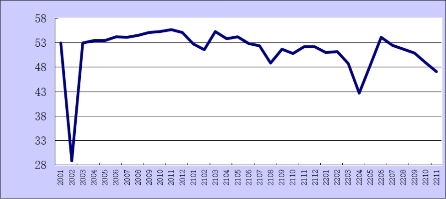 中國物流與采購聯合會、國家統計局服務業調查中心采購經理調查發布的2022年11月份綜合PMI產出指數為47.1%,較上月下降1.9個百分點。該指數是PMI指標體系中反映當期全行業(制造業和非制造業)產出變化情況的綜合指數,由制造業生產指數與非制造業商務活動指數加權求和而成,權數分別為制造業和非制造業占GDP的比重。