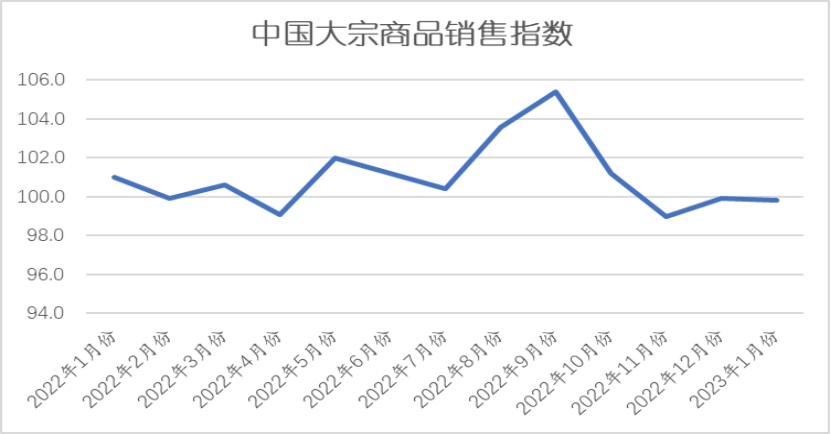 2023年1月份,大宗商品供應指數跌至2021年12月份以來的最低,本月較上月回落1.9個百分點,至99.6%,顯示受春節因素的影響,大部分生產企業提早進入假期模式,導致商品產量下降,市場供應出現明顯減少。從各主要商品來看,本月鋼鐵和汽車供應量止跌回升,成品油供應量增速減緩,鐵礦石、煤炭、有色金屬和化工供應量均出現不同程度的減少。