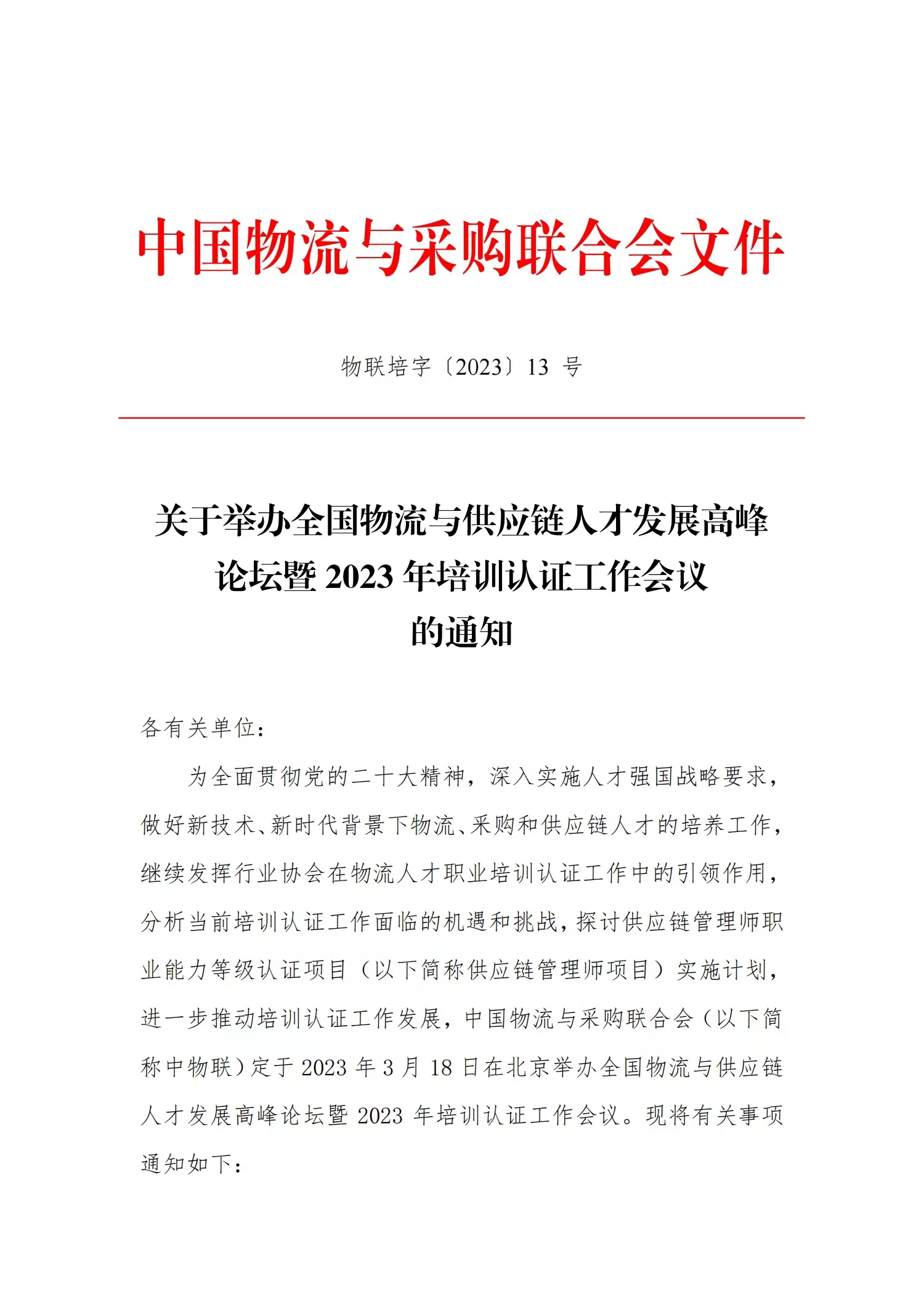 關于舉辦全國物流與供應鏈人才發展高峰論壇暨 2023年培訓認證工作會議的通知
