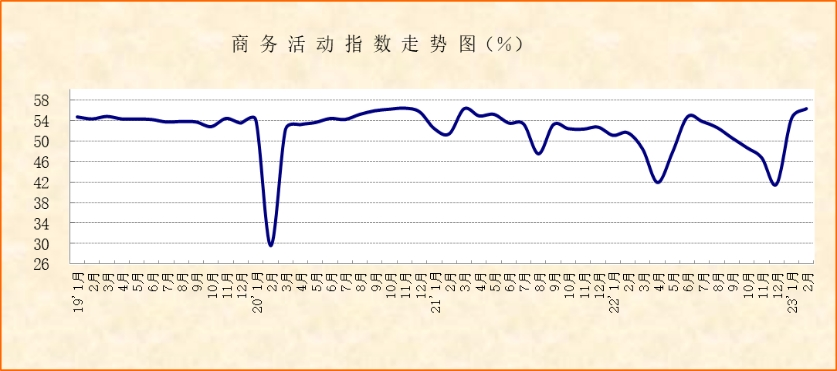中國物流與采購聯合會、國家統計局服務業調查中心發布的2023年2月份中國非制造業商務活動指數為56.3%,較上月上升1.9個百分點,新訂單指數為55.8%,較上月上升3.3個百分點,均實現連續2個月環比上升,升幅明顯。商務活動指數和新訂單指數繼上月重回50%以上后,繼續保持上升趨勢,顯示非制造業供需保持回穩向上態勢,經濟復蘇基礎得到進一步夯實。