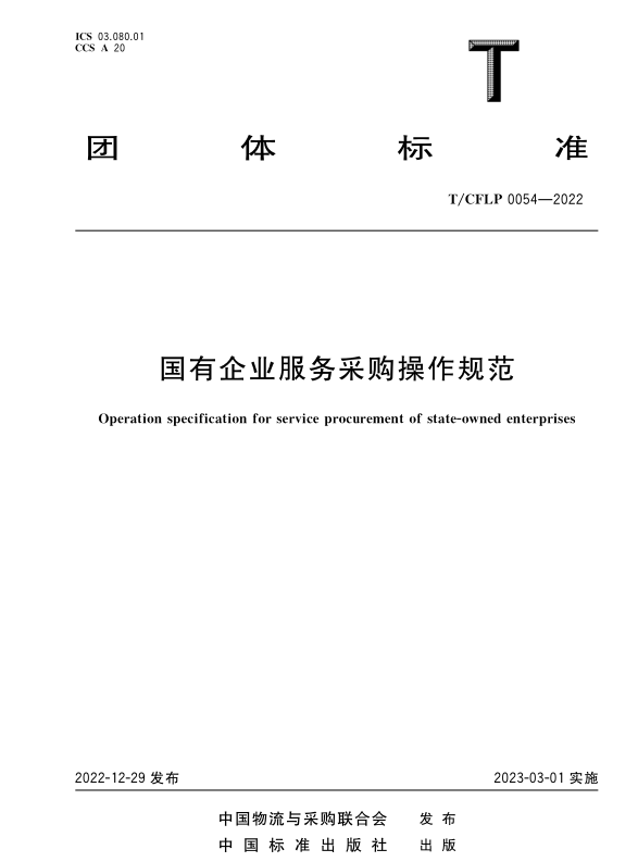 《國有企業服務采購操作規范》團體標準,由中國物流與采購聯合會公共采購分會牽頭編制,中國物流與采購聯合會團體標準化技術委員會歸口。70余家企業共同參與、前后耗時近3年編制完成,于2023年3月1日開始實施,標準號為T/CFLP 0054-2022。