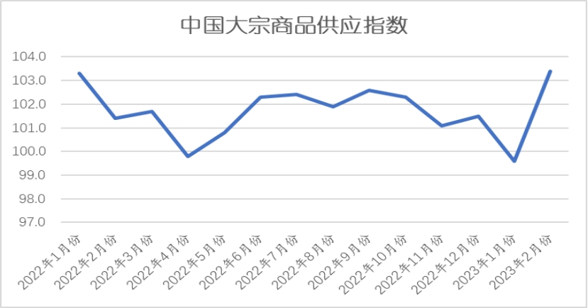 2023年2月份,大宗商品供應指數止跌回升,指數升至2021年3月份以來的最高,當月較上月回升3.8個百分點,至103.4%,顯示隨著商品價格的回升,企業利潤得到修復,生產積極性高漲,同時,隨著疫情影響基本消退以及春節結束,人員流動回歸正常,正常生產生活得到保障。另外,隨著春節假期的結束,物流運行明顯通暢,較好地保障了生產企業原材料采購和生產活動的穩定開展。此外,需求的復蘇令生產端預期后市,提高了生產熱情。各主要商品中,鐵礦石、煤炭、有色金屬和化工供應量觸底回升,鋼鐵、成品油和汽車供應量繼續增加,且增速加快。