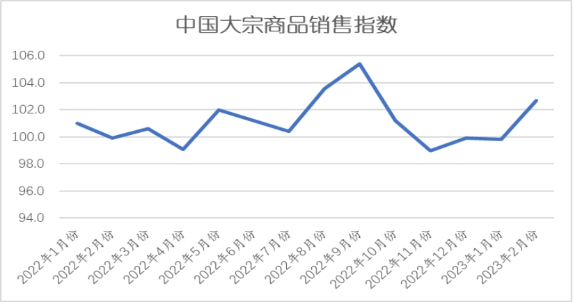 2023年2月份,大宗商品銷售指數止跌回升,至102.7%,指數反彈至近五個月以來的最高點,表明市場需求正在修復,商品銷售局面開始活躍,企業訂單組織逐步順暢。各主要商品中,本月各商品銷售量全部上升,其中鋼鐵、煤炭、有色金屬、化工和汽車銷售量均為止跌回升,鐵礦石和成品油銷售量繼續增加,且增速加快。