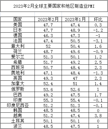 2023年2月份全球主要國家制造業PMI