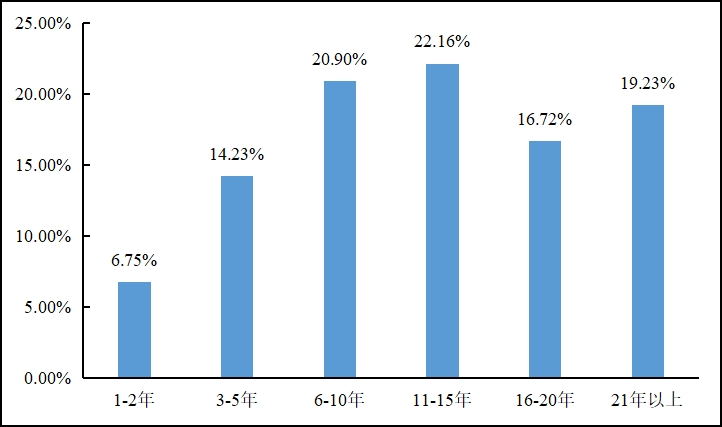 貨車司機中“老司機”占比較為穩定。調查數據顯示,從事道路貨運5年以上的貨車司機占比為79.01%;10年以上的占比為58.11%;15年以上的35.95%;20年以上的19.23%。“老司機”仍然是主要就業群體。同時,調查顯示,從事道路貨運5年以下的司機占比為20.98%,較上年調查有所增加,一批“新手”涌入市場。