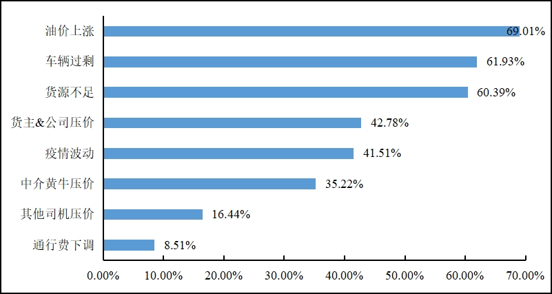 調查數據顯示,運價變化的主要原因:一是油價上漲成為最大成本推手。69.01%的貨車司機反映2022年造成運價變化的主要原因為油價上漲。油價上漲而運價沒有相應上漲乃至下跌,司機收益受到嚴重影響。2022年平均油價上漲幅度約3成,如果按照燃油成本占物流企業運輸總成本30%計算,總運輸成本上漲了約10%。由于大部分企業簽訂運輸合同沒有涉及油價聯動條款,在供過于求的市場環境下運輸企業、個體司機缺乏議價權。二是車輛過剩加劇市場低價競爭,61.93%的貨運司機反映2022年運價變化的主要原因為車輛過剩。三是貨源不足拉低整體價格。60.39%的貨車司機反映運價變化的主要原因是貨源不足。以上三個原因是運價變化最主要的原因。此外,40%左右的貨車司機反映存在貨主、企業和中介壓價問題,但是根本原因仍然是市場供過于求導致價格下降。