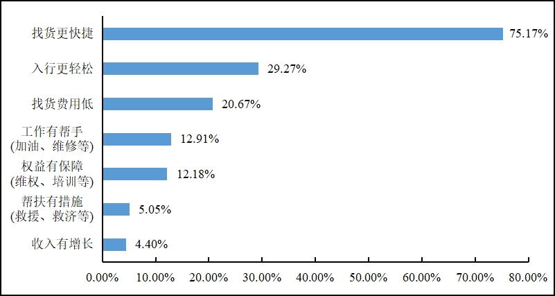 找貨更快捷是通過平臺找貨的最主要優勢。75.17%的貨車司機反映使用貨運互聯網平臺找貨更加快捷。通過使用互聯網平臺找貨也降低了入行門檻。29.27%的貨車司機表示利用平臺工具進入行業更加輕松。還有20.67%的貨車司機反映通過使用貨運互聯網平臺尋找貨源費用更低。此外,通過平臺找貨,也為司機獨立開展業務提供了工作幫手。通過平臺服務,司機權益也更有保障。一些平臺還實行了對于司機幫扶的措施。