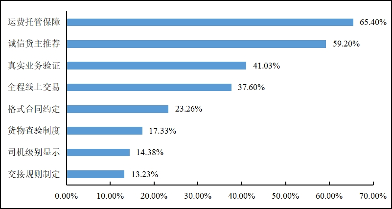貨車司機對平臺提供服務要求深化與業務結合。調查數據顯示,對于貨運互聯網平臺應該增加的服務,貨車司機希望與實際業務結合。包括提供運費托管保障、誠信貨主推薦、真實業務驗證、全程線上交易等四個方面,分別占比65.40%、59.20%、41.03%和37.60%。其中占比最多的是運費托管保障服務需求,貨車司機希望通過平臺進行運費托管,降低雙方違約風險。為了約束雙方關系,23.36%的貨車司機希望制定制式合同,17.33%的貨車司機希望增加貨物查驗制度,14.38%的貨車司機希望平臺增加司機級別顯示,13.23%的貨車司機希望制定交接規則,避免不必要的沖突和爭議。