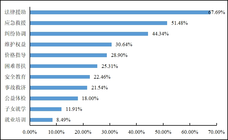 據調查數據顯示,貨車司機希望社會組織提供的公共性服務主要集中在維權類服務、救援類服務、救濟性服務、價監類服務和社保類服務五個方面。在維權類服務中,法律援助占比最高,達到67.69%;其次為糾紛協調和維護權益兩類維權服務分別占比為44.34%、30.64%;再次為救援類服務,主要集中在應急救援需求方面占比為51.48%,也是較為普遍的服務需求。在救濟性服務中,困難幫扶、事故救濟占比較多,均在20%以上。在價監類服務中,占比最多的為價格指導方面的服務,需求占比為28.9%。在社保類服務中,安全教育類服務占比較大,達到22.46%,其次為公益體檢、子女就學和就業培訓。