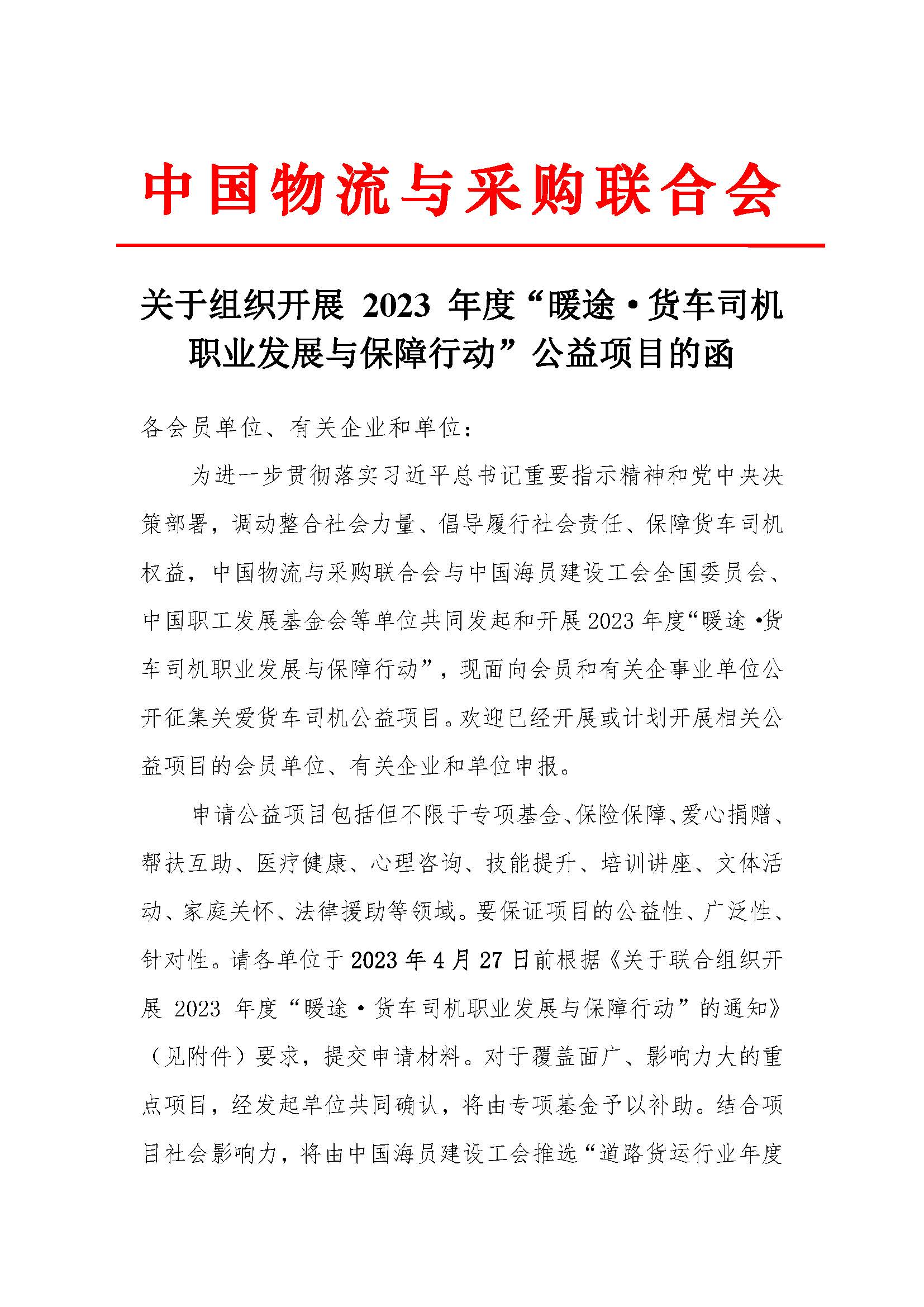 關于組織開展 2023年度“暖途·貨車司機 職業(yè)發(fā)展與保障行動”公益項目的函