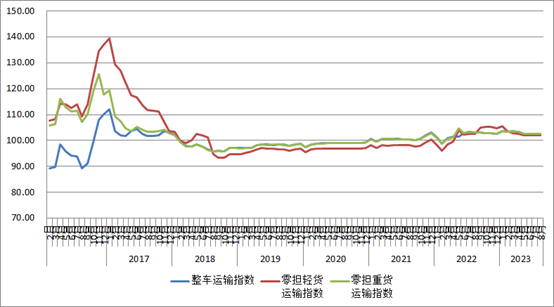 分車型指數(shù)看,各車型指數(shù)環(huán)比略有回升,同比去年持續(xù)低位。以大宗商品及區(qū)域運輸為主的整車指數(shù)為102.7點,比上月回升0.05%,比上年同期下降0.4%。零擔指數(shù)中,零擔輕貨指數(shù)為102點,比上月回升0.02%,比上年同期下降0.6%;零擔重貨指數(shù)為102.6點,比上月回升0.05%,比上年同期下降0.5%。