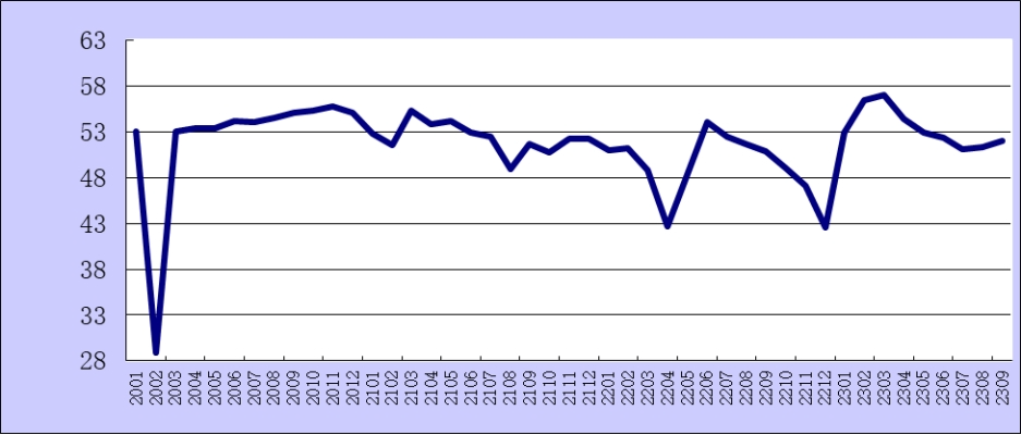 2020年1月-2023年9月綜合PMI產出指數走勢圖