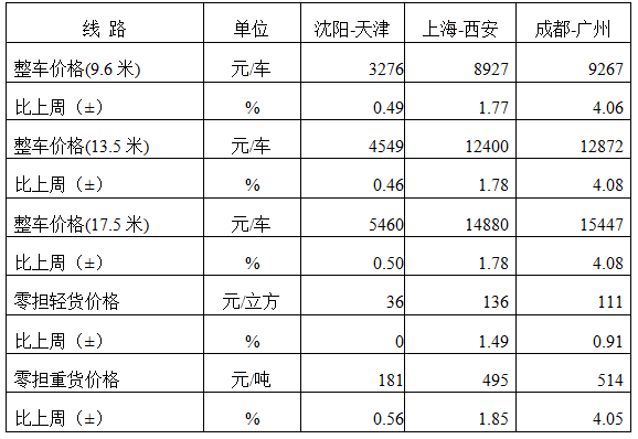分車型看,各車型指數環比繼續回升。其中,整車指數為1052.14點,比上周回升1.22%;零擔輕貨指數為1047.03點,比上周回升1.30%;零擔重貨指數為1051.21點,比上周回升1.22%。