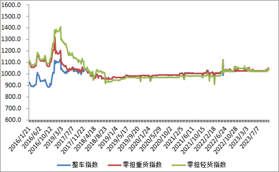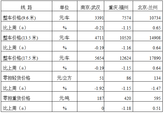 分車型看,各車型指數環比小幅回落。其中,整車指數為1039.07點,比上周回落1.24%;零擔輕貨指數為1033.71點,比上周回落1.27%;零擔重貨指數為1038.04點,比上周回落1.25%。
