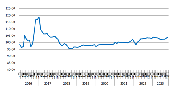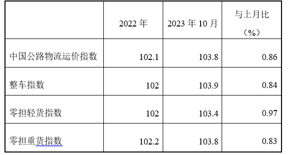 2023年10月份,由中國物流與采購聯(lián)合會和林安物流集團聯(lián)合調(diào)查的中國公路物流運價指數(shù)為103.8點,比上月回升0.86%,比去年同期增長0.49%。從周指數(shù)看,第一、四周運價指數(shù)環(huán)比回落,第二、三周運價指數(shù)環(huán)比回升。