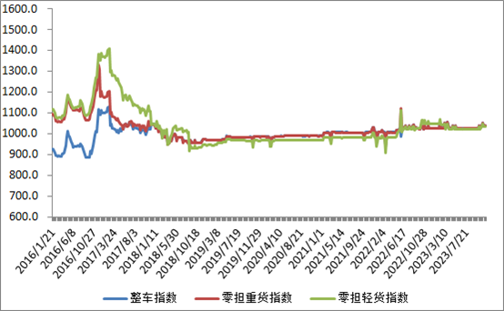 分車型看,各車型指數環比略有回落。其中,整車指數為1038.35點,比上周回落0.03%;零擔輕貨指數為1033.48點,比上周回落0.01%;零擔重貨指數為1037.31點,比上周回落0.04%。