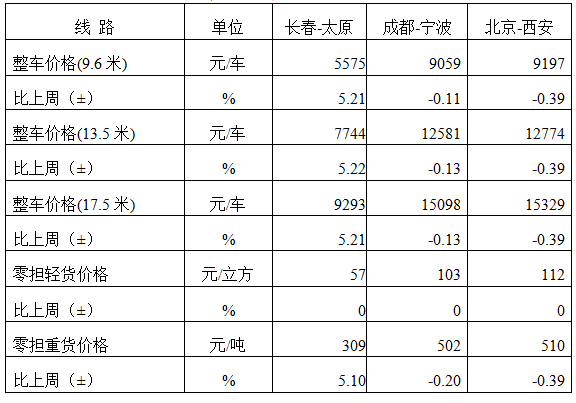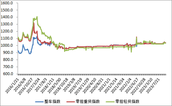 分車型看,各車型指數環比漲跌互現。其中,整車指數為1038.95點,比上周回升0.06%;零擔輕貨指數為1033.47點,與上周基本持平;零擔重貨指數為1037.91點,比上周回升0.06%。