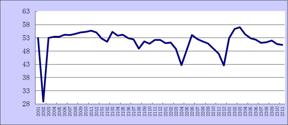 中國(guó)物流與采購(gòu)聯(lián)合會(huì)、國(guó)家統(tǒng)計(jì)局服務(wù)業(yè)調(diào)查中心采購(gòu)經(jīng)理調(diào)查發(fā)布的2023年11月份綜合PMI產(chǎn)出指數(shù)為50.4%,較上月下降0.3個(gè)百分點(diǎn)。該指數(shù)是PMI指標(biāo)體系中反映當(dāng)期全行業(yè)(制造業(yè)和非制造業(yè))產(chǎn)出變化情況的綜合指數(shù),由制造業(yè)生產(chǎn)指數(shù)與非制造業(yè)商務(wù)活動(dòng)指數(shù)加權(quán)求和而成,權(quán)數(shù)分別為制造業(yè)和非制造業(yè)占GDP的比重。