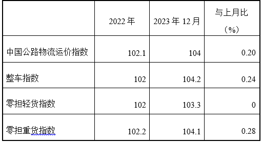 2023年12月份,由中國物流與采購聯(lián)合會和林安物流集團聯(lián)合調查的中國公路物流運價指數(shù)為104點,比上月回升0.2%,比去年同期回升0.9%。從周指數(shù)看,第一、四周運價指數(shù)環(huán)比回落,第二、三、五周運價指數(shù)環(huán)比回升。