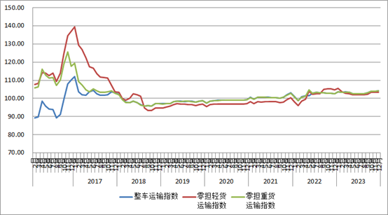 分車型指數(shù)看,各車型指數(shù)環(huán)比總體回升,同比去年漲跌互現(xiàn)。以大宗商品及區(qū)域運輸為主的整車指數(shù)為104.2點,比上月回升0.24%,比上年同期回升1.45%。零擔指數(shù)中,零擔輕貨指數(shù)為103.3點,與上月基本持平,比上年同期回落1.45%;零擔重貨指數(shù)為104.1點,比上月回升0. 28%,比上年同期回升1.52%。