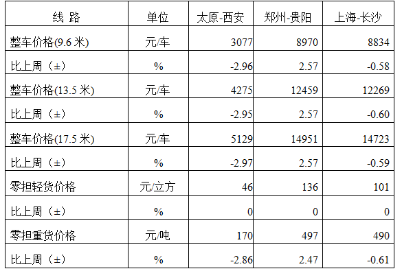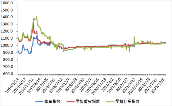 分車型看,各車型指數環比略有回落。其中,整車指數為1041.27點,比上周回落0.05%;零擔輕貨指數為1033.53點,與上周基本持平;零擔重貨指數為1040.27點,比上周回落0.05%。