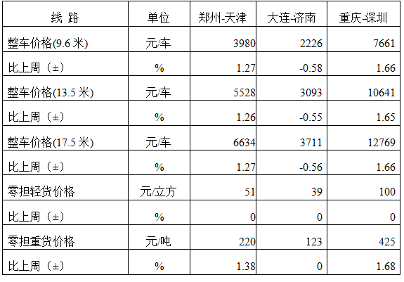 分車型看,各車型指數環比變化較小。其中,整車指數為1040.41點,與上周基本持平;零擔輕貨指數為1033.78點,比上周回升0.01%;零擔重貨指數為1039.46點,比上周回升0.01%。