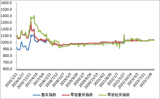 分車型看,各車型指數環(huán)比漲跌互現。其中,整車指數為1039.93點,比上周回落0.05%;零擔輕貨指數為1034.18點,比上周回升0.04%;零擔重貨指數為1038.93點,比上周回落0.05%。