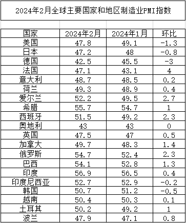 2024年2月份全球主要國家制造業PMI