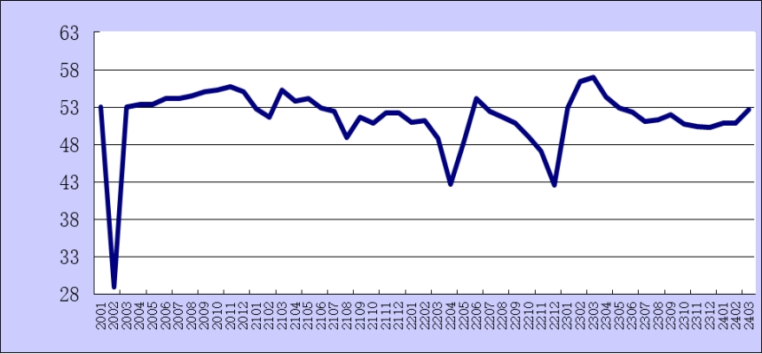 其中,2024年3月份,制造業(yè)生產(chǎn)指數(shù)為52.2%,較上月上升2.4個(gè)百分點(diǎn);非制造業(yè)商務(wù)活動(dòng)指數(shù)為53%,較上月上升1.6個(gè)百分點(diǎn)。