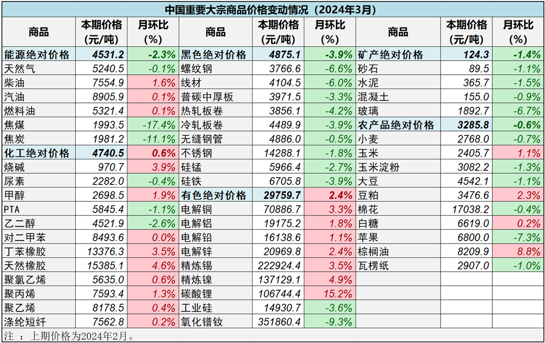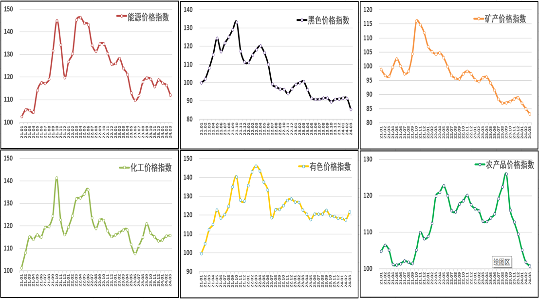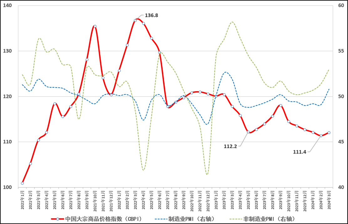 由中物聯(lián)大宗分會和上海鋼聯(lián)等單位聯(lián)合調(diào)查,中國物流與采購聯(lián)合會發(fā)布的2024年3月份中國大宗商品價格指數(shù)(CBPI)為112,環(huán)比小幅上升0.6%,同比下跌4.9%。從指數(shù)運行情況來看,3月份CBPI自低位小幅回升,表明隨各項穩(wěn)經(jīng)濟政策持續(xù)發(fā)力,市場信心有所恢復(fù)、下游消費逐步回暖、經(jīng)濟運行呈現(xiàn)恢復(fù)向好態(tài)勢。雖然當(dāng)前仍面臨國際形勢復(fù)雜多變、市場需求疲弱、生產(chǎn)規(guī)模減少等不利因素,但結(jié)合各分項指數(shù)表現(xiàn)來看,市場整體正處于筑底過程。