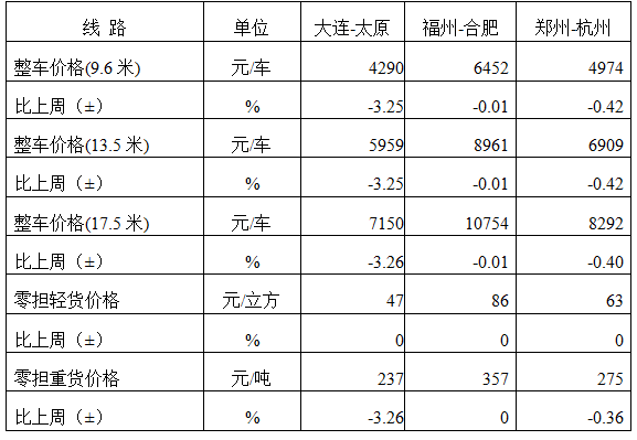 分車型看,各車型指數環比略微回落。其中,整車指數為1025.20點,比上周回落0.01%;零擔輕貨指數為1020.74點,比上周回落0.01%;零擔重貨指數為1024.02點,與上周基本持平。