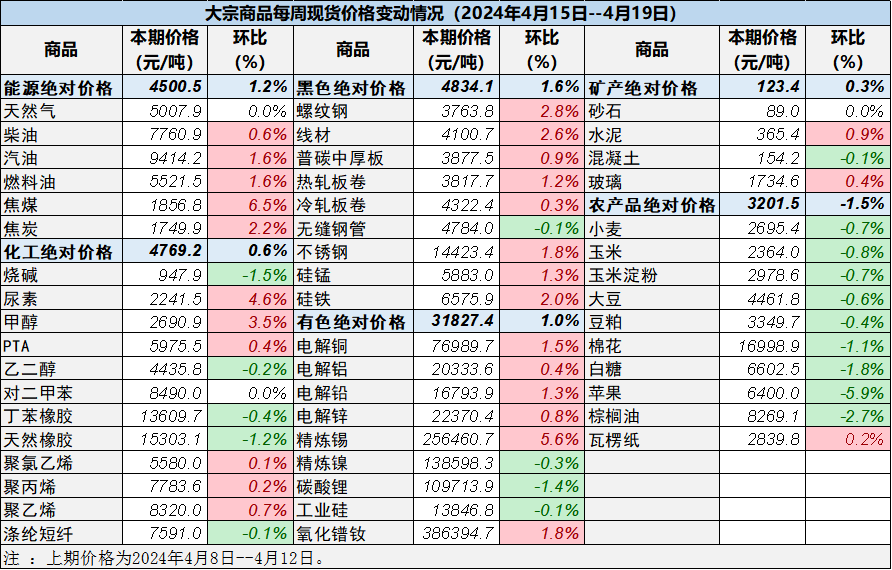 本表所示大宗商品價格(類別與產品規格說明見附表)為以人民幣計價的現貨價格(包含流通費用、利潤和稅費等)。計算這些價格時使用的信息來源,主要包括國內重點地區的生產商、貿易商及下游消費企業之間的成交、詢報盤及可成交價格。價格單位為人民幣元/噸。