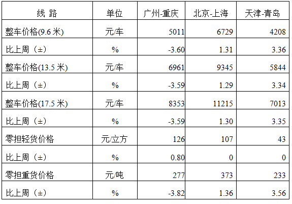 分車型看,各車型指數環比均有回升。其中,整車指數為1042.81點,比上周回升1.68%;零擔輕貨指數為1029.23點,比上周回升0.84%;零擔重貨指數為1042.43點,比上周回升1.77%。