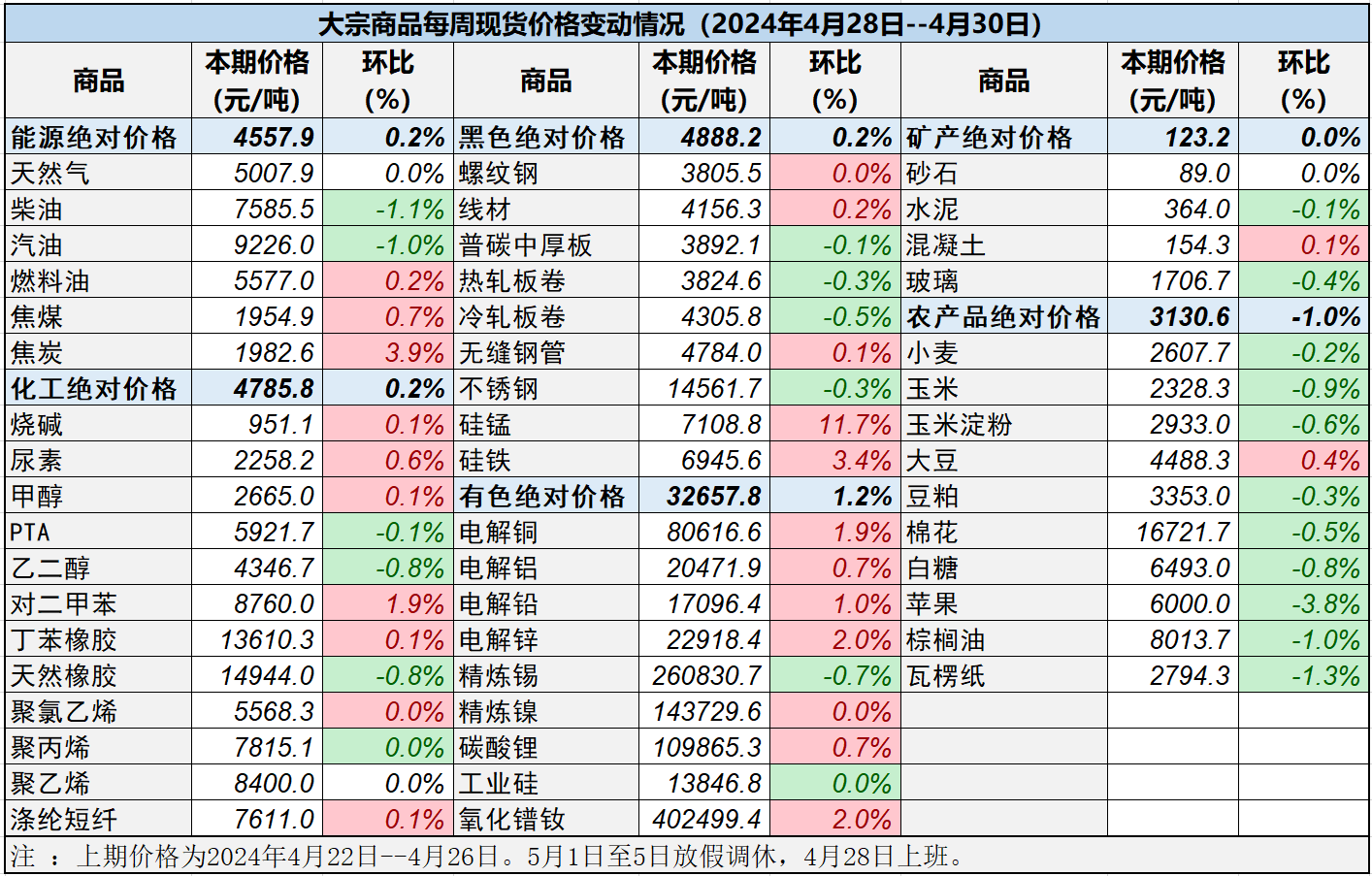 本表所示大宗商品價格(類別與產品規格說明見附表)為以人民幣計價的現貨價格(包含流通費用、利潤和稅費等)。計算這些價格時使用的信息來源,主要包括國內重點地區的生產商、貿易商及下游消費企業之間的成交、詢報盤及可成交價格。價格單位為人民幣元/噸。