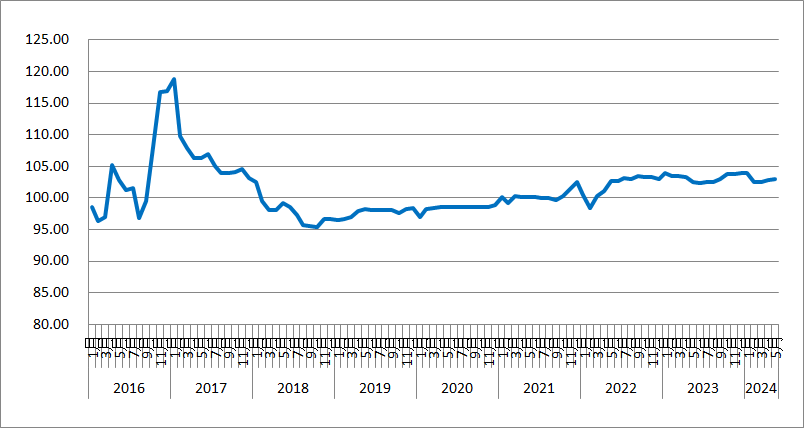 2024年5月份,由中國物流與采購聯(lián)合會和林安物流集團聯(lián)合調(diào)查的中國公路物流運價指數(shù)為103點,比上月回升0.13%,比去年同期回升0.39%。從周指數(shù)看,第一、五周運價指數(shù)環(huán)比回落,第二、三、四周運價指數(shù)環(huán)比回升。