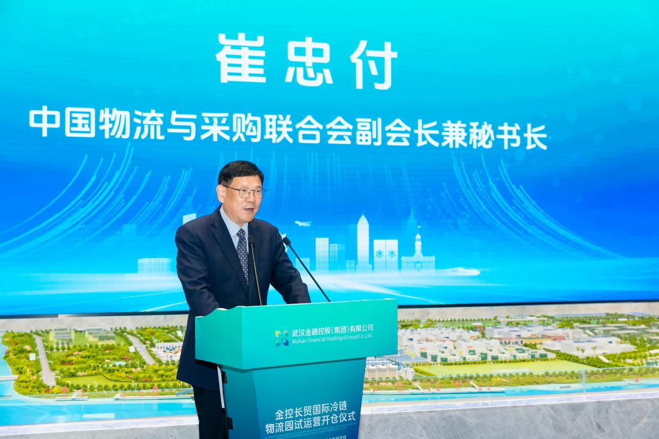 2024年6月1日,金控長貿國際冷鏈物流園試運營開倉儀式在湖北武漢舉行,中國物流與采購聯合會副會長兼秘書長崔忠付出席并致辭。武漢金融控股(集團)有限公司黨委副書記、總經理丁震,武漢長江國際貿易集團有限公司下屬武漢經發糧食物流產業投資有限公司副總經理余沫,武漢市商務局一級調研員馬宗輝以及增益冷鏈、川為凍品等有關政府、行業協會、企業三方代表140余人參與了開倉儀式。