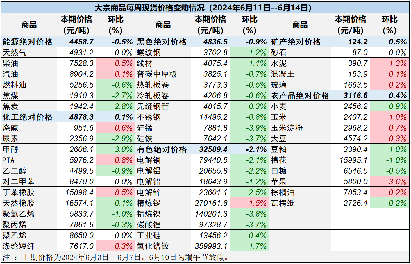 本表所示大宗商品價格(類別與產品規格說明見附表)為以人民幣計價的現貨價格(包含流通費用、利潤和稅費等)。計算這些價格時使用的信息來源,主要包括國內重點地區的生產商、貿易商及下游消費企業之間的成交、詢報盤及可成交價格。價格單位為人民幣元/噸。