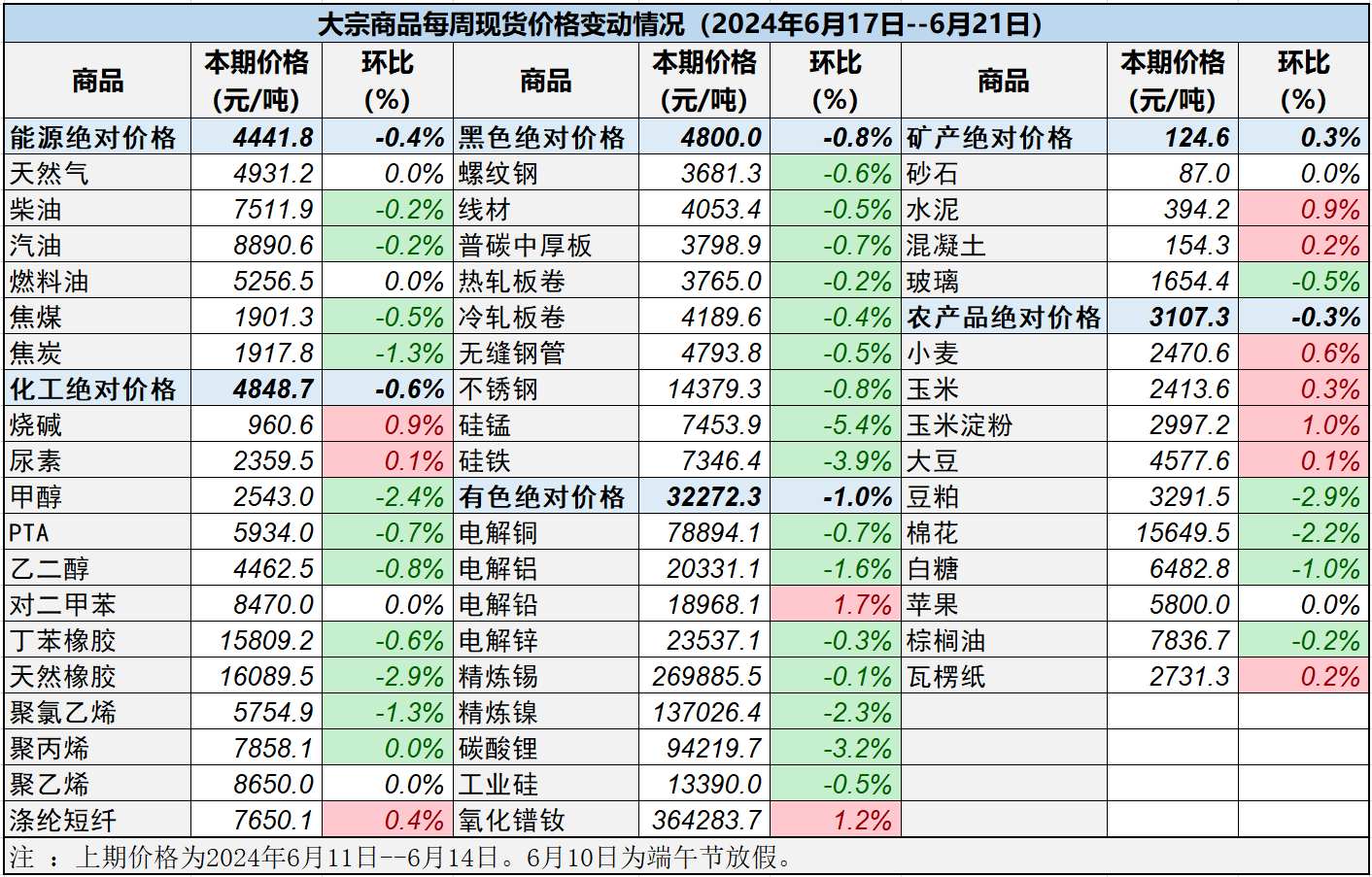本表所示大宗商品價格(類別與產品規格說明見附表)為以人民幣計價的現貨價格(包含流通費用、利潤和稅費等)。計算這些價格時使用的信息來源,主要包括國內重點地區的生產商、貿易商及下游消費企業之間的成交、詢報盤及可成交價格。價格單位為人民幣元/噸。