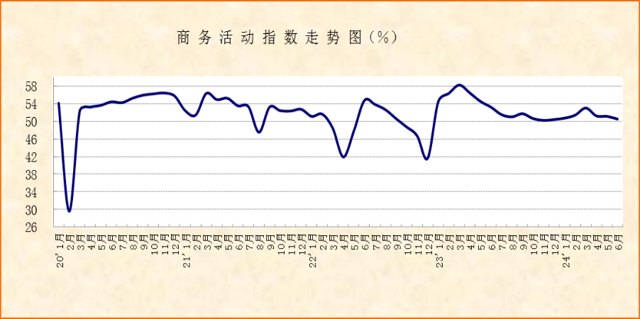 中國物流與采購聯合會、國家統計局服務業調查中心發布的2024年6月份中國非制造業商務活動指數為50.5%,較上月下降0.6個百分點,但仍在50%以上,意味著非制造業經營活動仍保持擴張態勢,但增速較上月有所放緩。分行業看,建筑業和服務業的商務活動指數較上月均有不同程度下降,但均在50%以上。繼上月五一假期需求集中釋放后,接觸型消費相關服務業活動在高基數基礎上有所回落,是導致非制造業增速放緩的主要因素。零售業、住宿業、餐飲業和文體娛樂相關行業的商務活動指數較上月均有不同程度下降?;ㄍ顿Y相關行業、貨幣金融服務業與信息服務相關行業表現良好,成為6月非制造業經營活動保持擴張的主要支撐力量。