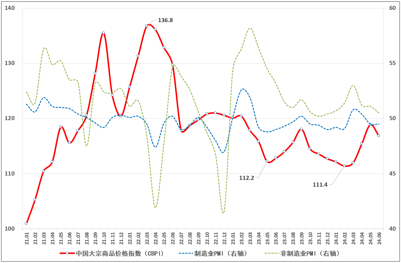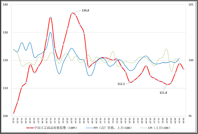 由中物聯(lián)大宗分會和上海鋼聯(lián)等單位聯(lián)合調查,中國物流與采購聯(lián)合會發(fā)布的2024年6月份中國大宗商品價格指數(shù)(CBPI)為116.8點,環(huán)比回落1.7%,同比上漲3.6%。從指數(shù)運行情況來看,6月份CBPI因進入高溫多雨季節(jié)等因素影響而有所回落,但仍處于年內高位,表明隨系列宏觀政策持續(xù)靠前發(fā)力,大宗市場景氣水平和企業(yè)生產經(jīng)營活動基本穩(wěn)定,總體保持擴張,但增速有所放緩。從國內外大宗商品價格指數(shù)走勢來看,國內外市場需求偏弱仍是當前面臨的主要問題,當前我國大宗市場正處于蓄力回升的關鍵階段,增強經(jīng)濟增長內生動力,仍需加大宏觀政策調節(jié)力度,進一步發(fā)揮流通業(yè)在穩(wěn)增長、降成本和促消費中的重要作用,著力打通制約經(jīng)濟循環(huán)的卡點堵點。