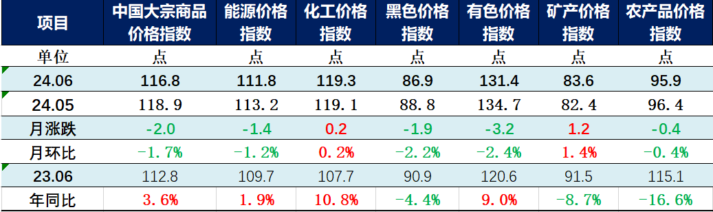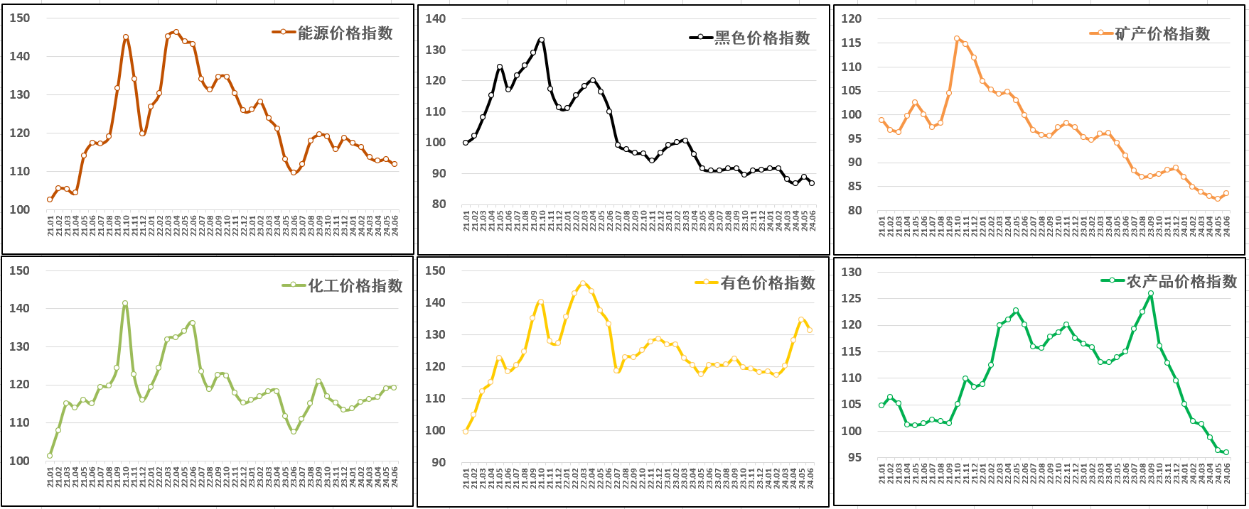 分行業(yè)看:有色、黑色、能源和農產品指數(shù)下跌,礦產品、化工價格指數(shù)環(huán)比上漲。其中,有色價格指數(shù)自高點回落,報131.4點,月環(huán)比下跌2.4%,年同比上漲9%;黑色價格指數(shù)小幅下行,報86.9點,月環(huán)比下跌2.2%,年同比下跌4.4%;能源價格指數(shù)再度下探,創(chuàng)近11個月以來低點,報111.8點,月環(huán)比下跌1.2%,年同比上漲1.9%;農產品價格指數(shù)延續(xù)跌勢,但跌幅收窄,報95.9點,月環(huán)比下跌0.4%,年同比下跌16.6%;化工價格指數(shù)再創(chuàng)年內新高,但漲幅收窄,報119.3點,月環(huán)比上漲0.2%,年同比上漲10.8%;礦產價格指數(shù)自低點反彈,報83.6點,月環(huán)比上漲1.4%,年同比下跌8.7%。