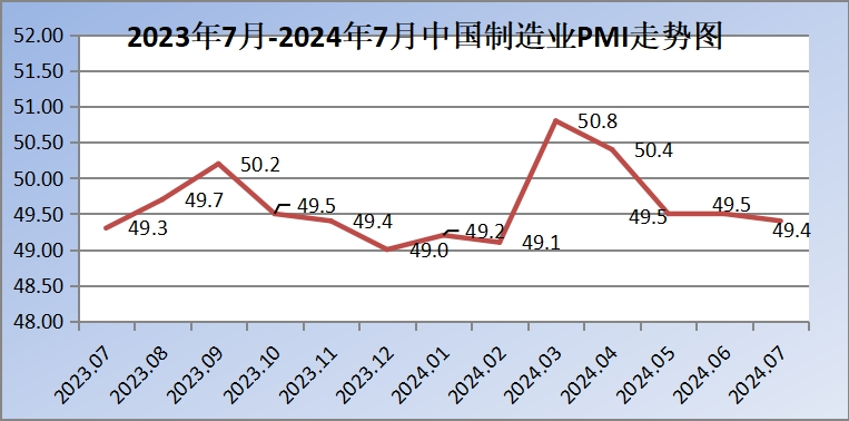 中國物流與采購聯合會、國家統計局服務業調查中心發布的2024年7月份中國制造業采購經理指數(PMI)為49.4%,比上月下降0.1個百分點。