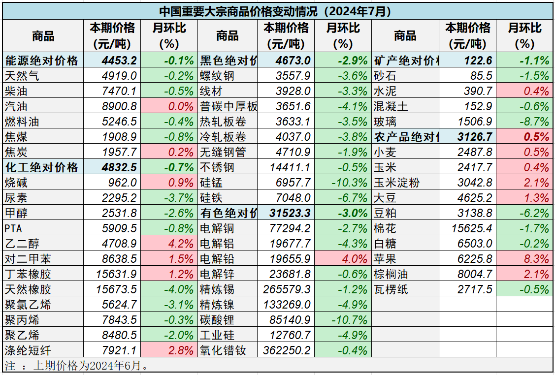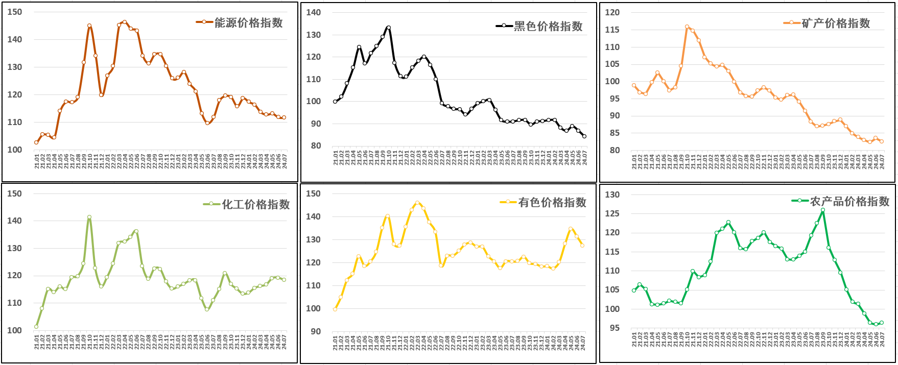 分行業看:有色、黑色、礦產、化工和能源價格指數下跌,農產品價格指數環比上漲。其中,有色價格指數連續兩月下跌,報127.5點,月環比下跌3%,年同比上漲5.8%;黑色價格指數繼續走低,報84.3點,月環比下跌2.9%,年同比下跌7.3%;礦產價格指數整蕩走低,報82.6點,月環比下跌1.1%,年同比下跌6.4%;化工價格指數自高點回落,報118.5點,月環比下跌0.7%,年同比上漲6.6%;能源價格指數跌幅收窄,報111.6點,月環比下跌0.1%,年同比下跌0.2%;農產品價格指數止跌反彈,結束近十個月跌勢,報96.4點,月環比上漲0.5%,年同比下跌19.2%。
