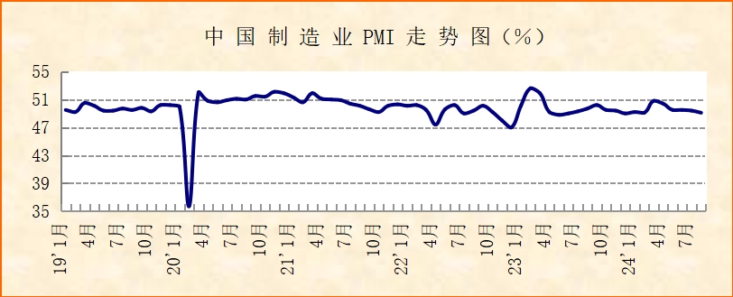 中國(guó)物流與采購(gòu)聯(lián)合會(huì)、國(guó)家統(tǒng)計(jì)局服務(wù)業(yè)調(diào)查中心發(fā)布的2024年8月份中國(guó)制造業(yè)采購(gòu)經(jīng)理指數(shù)(PMI)為49.1%,較上月下降0.3個(gè)百分點(diǎn),連續(xù)4個(gè)月保持在49%以上,結(jié)合前期走勢(shì),經(jīng)濟(jì)運(yùn)行整體相對(duì)穩(wěn)定。從分項(xiàng)指數(shù)變化來看,市場(chǎng)供需略有放緩,新動(dòng)能較快回升,市場(chǎng)價(jià)格明顯下降,企業(yè)成本有所減輕,后期經(jīng)濟(jì)具備穩(wěn)定回升基礎(chǔ)。