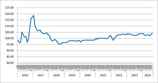 2024年8月份,由中國物流與采購聯合會和林安物流集團聯合調查的中國公路物流運價指數為104.2點,比上月回升1.03%,比去年同期回升1.63%。從周指數看,第一周運價指數環比回落,第二、三、四、五周運價指數環比回升。