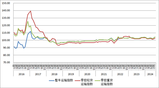 分車型指數看,各車型指數環比保持回升,同比去年小幅回升。以大宗商品及區域運輸為主的整車指數為104.5點,比上月回升1.06%,比上年同期回升1.80%。零擔指數中,零擔輕貨指數為102.9點,比上月回升0.88%,比上年同期回升0.82%;零擔重貨指數為104.5點,比上月回升1.06%,比上年同期回升1.86%。