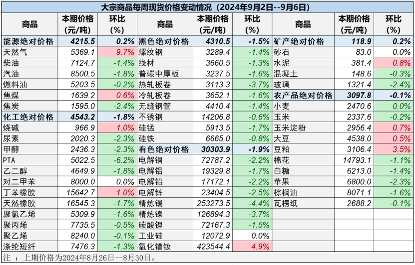 據中國物流與采購聯合會對全國50種重要大宗商品市場價格調查顯示,本期價格(2024年9月2日至9月6日)與上期價格相比,9種(占比18%)價格上漲,38種(占比76%)大宗商品價格下跌, 3種(占比6%)價格持平。